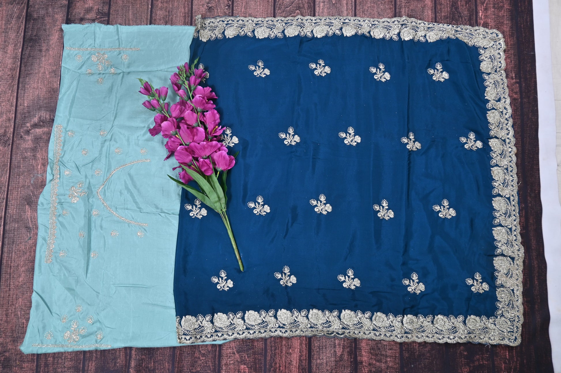 Upgrade your ethnic wardrobe with this elegant Designer Satin Silk Saree featuring beautiful Gotta Patti Cut Work. The smooth satin silk fabric gives a rich and graceful drape, perfect for weddings, festive celebrations and special occasions.